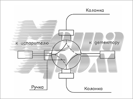 Backflush valve is a 4-step valve designed for the change of eluent flow in the packed column and for blowoff of heavy components from the entry of the column back into detector. The valve is attached to the lower panel (bottom) of the module, meanwhile taking the temperature of column thermostat. Two upper fittings (see pic.) serve for column connection, two other ones are connected to evaporator and detector.